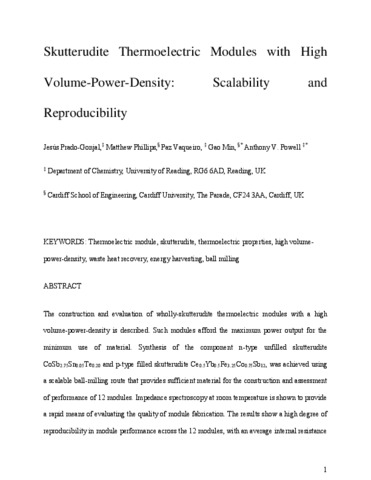Skutterudite thermoelectric modules with high volume-power-density: scalability and reproducibility.