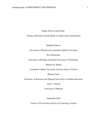 Pekrun, R., Murayama, K., Marsh, H. W., Goetz, T. and Frenzel, A. C. (2019) Happy fish in little ponds: testing a reference group model of achievement and emotion. Journal of Personality and Social Psychology, 117 (1). pp. 166-185. ISSN 1939-1315 doi: 10.1037/pspp0000230