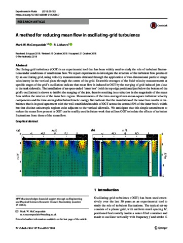 McCorquodale, M. W. and Munro, R. J. (2018) A method for reducing mean flow in oscillating‑grid turbulence. Experiments in Fluids, 59. 182. ISSN 1432-1114 doi: 10.1007/s00348-018-2636-7