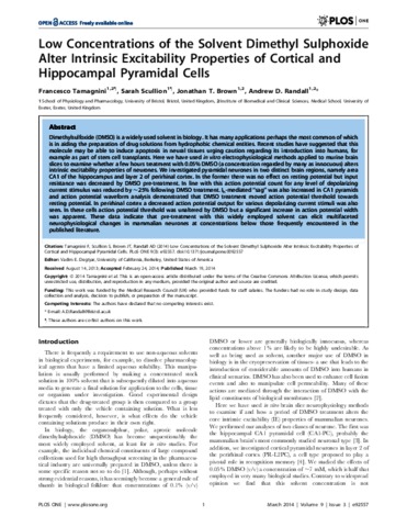 Low concentrations of the solvent dimethyl sulphoxide alter intrinsic excitability properties of cortical and hippocampal pyramidal cells.