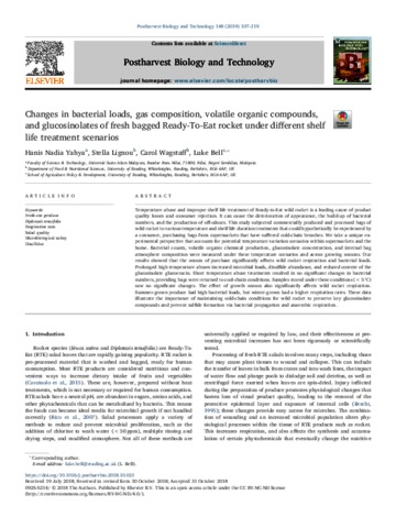 Yahya, H. N., Lignou, S. orcid id iconORCID: https://orcid.org/0000-0001-6971-2258, Wagstaff, C. orcid id iconORCID: https://orcid.org/0000-0001-9400-8641 and Bell, L. orcid id iconORCID: https://orcid.org/0000-0003-2895-2030 (2019) Changes in bacterial loads, gas composition, volatile organic compounds, and glucosinolates of fresh bagged Ready-To-Eat rocket under different shelf life treatment scenarios. Postharvest Biology and Technology, 148. pp. 107-119. ISSN 09255214 doi: 10.1016/j.postharvbio.2018.10.021