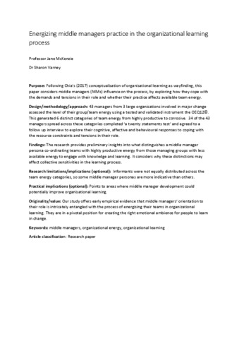 Purpose This paper aims to consider middle managers' influence on organizational learning by exploring how they cope with demands and tensions in their role and whether their practice affects available team energy. Design/methodology/approach In total, 43 managers from three large organizations involved in major change assessed their group's energy using a tested and validated instrument, the OEQ12©. This generated six distinct categories of team energy, from highly productive to corrosive. Thirty-four of these managers, spread across the six categories, completed a Twenty Statements Test and a follow-up interview to explore their cognitive, affective and behavioural responses to coping with resource constraints and tensions in their role. Findings The research provides preliminary insights into what distinguishes a middle manager persona co-ordinating teams with highly productive energy from those managing groups with less available energy to engage with knowledge and learning. It considers why these distinctions may affect collective sensitivities in the organizational learning process. Research limitations/implications Informants were not equally distributed across the six team energy categories; therefore, some middle manager personas are more indicative than others. Practical implications This research suggests areas where middle manager development could potentially improve organizational learning. Originality/value This study offers early empirical evidence that middle managers' orientation to their role is entangled with the process of energizing their teams in organizational learning during change.