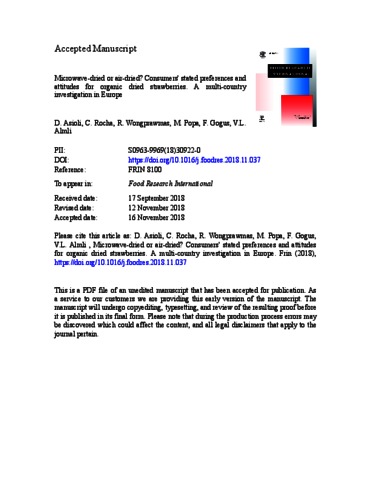 Asioli, D. orcid id iconORCID: https://orcid.org/0000-0003-2274-8450, Rocha, C., Wongprawmas, R., Popa, M., Gogus, F. and Almli, V. L. (2019) Microwave-dried or air-dried? Consumers' stated preferences and attitudes for organic dried strawberries. A multi-country investigation in Europe. Food Research International, 120. pp. 763-775. ISSN 0963-9969 doi: 10.1016/j.foodres.2018.11.037