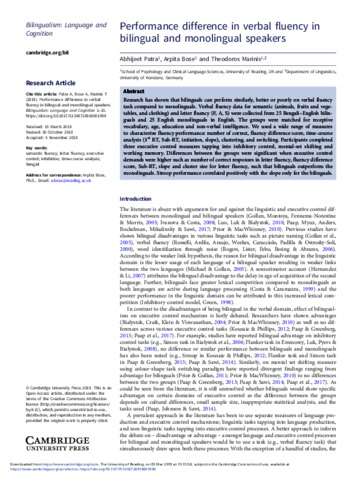 Performance difference in verbal fluency in bilingual and monolingual speakers.