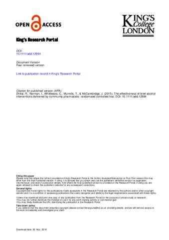 Dhital, R., Norman, I., Whittlesea, C., Murrells, T. and McCambridge, J. (2015) The effectiveness of brief alcohol interventions delivered by community pharmacists: randomized controlled trial. Addiction, 110 (10). pp. 1586-1594. ISSN 0965-2140 doi: 10.1111/add.12994