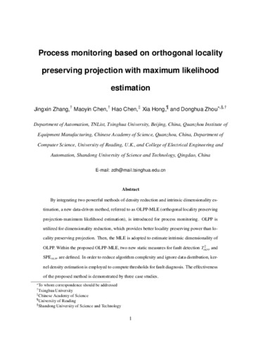 Zhang, J., Chen, M., Chen, H., Hong, X. orcid id iconORCID: https://orcid.org/0000-0002-6832-2298 and Zhou, D. (2019) Process monitoring based on orthogonal locality preserving projection with maximum likelihood estimation. Industrial & Engineering Chemistry Research, 58 (14). pp. 5579-5587. ISSN 1520-5045 doi: 10.1021/acs.iecr.8b05875