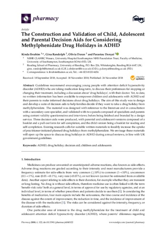 Ibrahim, K., Randolph, G., Doran, O. and Donyai, P. orcid id iconORCID: https://orcid.org/0000-0001-5403-6170 (2018) The construction and validation of child, adolescent and parental decision aids for considering methylphenidate drug holidays in ADHD. Pharmacy, 6 (4). 122. ISSN 2226-4787 doi: 10.3390/pharmacy6040122