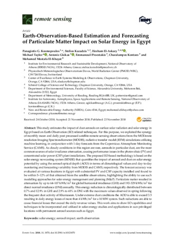 Kosmopoulos, P. G., Kazadzis, S., El-Askary, H., Taylor, M., Gkikas, A., Proestakis, E., Kontoes, C. and El-Khayat, M. M. (2018) Earth-observation-based estimation and forecasting of particulate matter impact on solar energy in Egypt. Remote Sensing, 10 (12). 1870. ISSN 2072-4292 doi: 10.3390/rs10121870