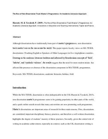 Although dissertations have traditionally been part of master’s programmes, non-dissertation track master’s are on the rise across the world. This paper reports faculty views on MA TESOL dissertations (Teaching English to Speakers of Other Languages) in five Anglophone countries. Drawing on the academic literacies tradition and informed by Bourdieusian concepts of ‘field’, ‘habitus’, and ‘symbolic violence’, the results suggest that the need for more student intake has affected the presence or absence of the dissertation component in MA TESOL programmes.