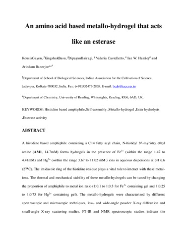 A histidine-based amphiphile containing a C14 fatty acyl chain, N- histidyl N′-myristry ethyl amine (AM1, 14.7 mM) forms hydrogels in the presence of Fe3+ (within the range 1.47 to 4.41 mM) and Hg2+ (within the range 3.67 to 11.02 mM) ions in aqueous dispersions at pH 6.6 (27 °C). The imidazole ring of the histidine residue plays a vital role to interact with these metal-ions. The thermal and mechanical stability of these metallo-hydrogels can be tuned by changing the proportion of amphiphile to metal ion ratio (1:0.1 to 1:0.3 for Fe3+-containing gel and 1:0.25 to 1:0.75 for Hg2+-containing gel). The metallo-hydrogels were characterized by different spectroscopic and microscopic techniques, low- and wide-angle powder X-ray diffraction, and small-angle X-ray scattering studies. FT-IR and NMR spectroscopic studies indicate the participation of the imidazole ring in metal-ion binding. Low- and wide-angle powder X-ray diffraction and small-angle X-ray scattering data are in favor of a layered structure of the supramolecular assembly of the AM1 in the presence of metal-ions. Both, the amphiphiles and the metal ion induced hydrogels reveal catalytic activity of p-nitrophenyl esters hydrolysis for the acetyl, n-butyl and n-octyl esters . Ferric ion containing metallo-hydrogel exhibits higher catalytic activity than the corresponding AM1 aggregate in the absence of metal ions.