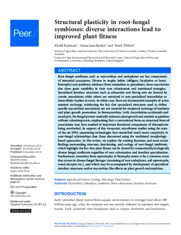 Kariman, K., Barker, S. J. and Tibbett, M. orcid id iconORCID: https://orcid.org/0000-0003-0143-2190 (2018) Structural plasticity in root-fungal symbioses: diverse interactions lead to improved plant fitness. PeerJ, 6. e6030. ISSN 2167-8359 doi: 10.7717/peerj.6030