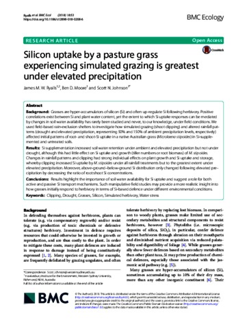 Background Grasses are hyper-accumulators of silicon (Si) and often up-regulate Si following herbivory. Positive correlations exist between Si and plant water content, yet the extent to which Si uptake responses can be mediated by changes in soil water availability has rarely been studied and never, to our knowledge, under field conditions. We used field-based rain-exclusion shelters to investigate how simulated grazing (shoot clipping) and altered rainfall patterns (drought and elevated precipitation, representing 50% and 150% of ambient precipitation levels, respectively) affected initial patterns of root- and shoot-Si uptake in a native Australian grass (Microlaena stipoides) in Si-supplemented and untreated soils. Results Si supplementation increased soil water retention under ambient and elevated precipitation but not under drought, although this had little effect on Si uptake and growth (tiller numbers or root biomass) of M. stipoides. Changes in rainfall patterns and clipping had strong individual effects on plant growth and Si uptake and storage, whereby clipping increased Si uptake by M. stipoides under all rainfall treatments but to the greatest extent under elevated precipitation. Moreover, above-ground–below-ground Si distribution only changed following elevated precipitation by decreasing the ratio of root:shoot Si concentrations. Conclusions Results highlight the importance of soil water availability for Si uptake and suggest a role for both active and passive Si transport mechanisms. Such manipulative field studies may provide a more realistic insight into how grasses initially respond to herbivory in terms of Si-based defence under different environmental conditions.