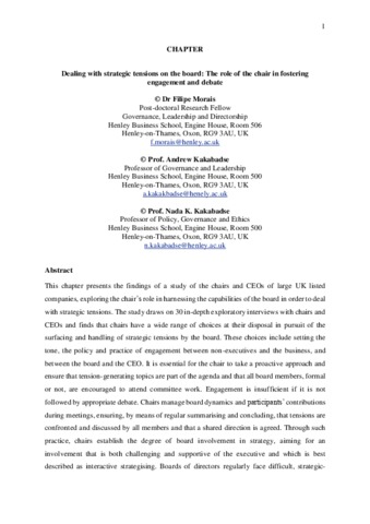 Morais, F. orcid id iconORCID: https://orcid.org/0000-0003-1297-6556, Kakabadse, A. orcid id iconORCID: https://orcid.org/0000-0002-0031-7767 and Kakabadse, N. orcid id iconORCID: https://orcid.org/0000-0002-9517-8279 (2019) Dealing with strategic tensions on the board: the role of the chair in fostering engagement and debate. In: Gabrielsson, J., Khlif, W. and Yamak, S. (eds.) Research Handbook on Boards of Directors. Edward Elgar, pp. 31-48. ISBN 9781786439741