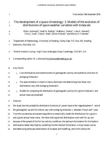 The development of a space climatology: 3. Models of the evolution of distributions of space weather variables with timescale.