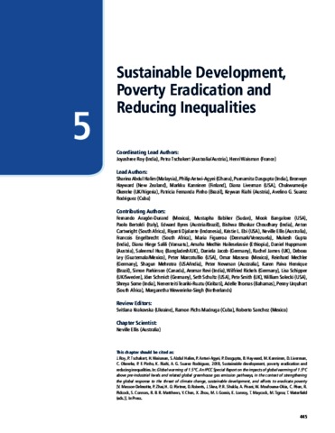 Roy, J., Tscharket, P., Waisman, H., Abdul Halim, S., Antwi-Agyei, P., Dasgupta, P., Hayward, B., Kanninen, M., Liverman, D., Okereke, C., Pinho, P. F., Riahi, K. and Suarez Rodriguez, A. G. (2018) Sustainable development, poverty eradication and reducing inequalities. In: Masson-Delmotte, V., Zhai, P., Pörtner, H. O., Roberts, D., Skea, J., Shukla, P. R., Pirani, A., Moufouma-Okia, W., Péan, C., Pidcock, R., Connors, S., Matthews, R. B. R., Chen, Y., Zhou, X., Gomis, M. I., Lonnoy, E., Maycock, T., Tignor, M. and Waterfield, T. (eds.) Global Warming of 1.5°C: An IPCC Special Report. Cambridge University Press.