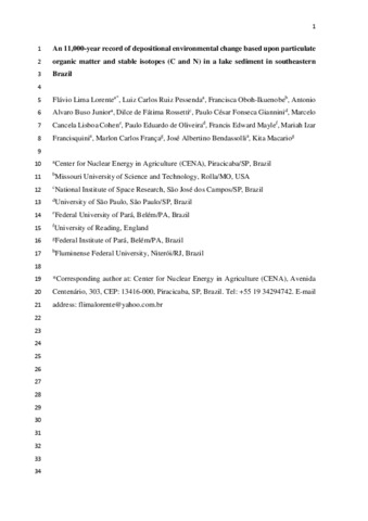 The aim of this paper is to reconstruct an 11,000-year history of depositional environmental change in southeastern Brazil, based upon the integration of particulate organic matter and stable isotope (C and N) data from a 136-cm sediment core from Lake Canto Grande. These proxies are used to explore the evolution of terrestrial and marine influence on the lake. Isotopic (δ13C: -7.8‰ to -31.9‰; δ15N: -0.07‰ to 4.9‰) and elemental (total organic carbon - TOC: 0.58% to 37.19%; total nitrogen - TN: 0.08% to 1.73%; C/N: 0.3 to 54.7) values recorded in Lake Canto Grande suggest that the sedimentary organic matter was derived from mostly C3 land plants and freshwater phytoplankton. Particulate organic matter and cluster analyses distinguished four associations characterized by the predominance of amorphous organic matter, followed by phytoclasts and palynomorphs. These results indicate two different phases of lake evolution. The first phase (136 - 65 cm; ~10,943 cal yr. B.P. to ~8,529 cal yr. B.P.) is recorded by sand layers interbedded with mud, which contain amorphous organic matter (AOM, 45-59%) and phytoclasts (opaques - OP: 6-18%; non-opaques – NOP: 17-23%) which indicate a floodplain area. The second phase (65 – 0 cm; ~8,529 cal yr. B.P. to ~662 cal yr. B.P.) comprises mud, AOM (68-86%) and palynomorphs (PAL, 8-16%) related to lake establishment comparable to modern conditions. Thus, characterizing particulate organic matter, in combination with stable isotopes, proved to be invaluable proxies for lacustrine paleoenvironmental change through the Holocene.