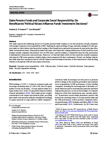 Hoepner, A. G. F. and Schopohl, L. orcid id iconORCID: https://orcid.org/0000-0002-2150-3593 (2020) State pension funds and corporate social responsibility: do beneficiaries’ political values influence funds’ investment decisions? Journal of Business Ethics, 165. pp. 489-516. ISSN 1573-0697 doi: 10.1007/s10551-018-4091-z