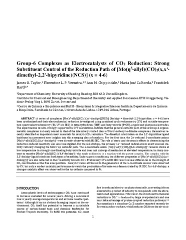 Taylor, J. O., Veenstra, F. L. P., Chippindale, A. M. orcid id iconORCID: https://orcid.org/0000-0002-5918-8701, Calhorda, M. J. and Hartl, F. orcid id iconORCID: https://orcid.org/0000-0002-7013-5360 (2019) Group 6 metal complexes as electrocatalysts of CO2 reduction: strong substituent control of the reduction path of [Mo(η3-allyl)(CO)2(x,x′-dimethyl-2,2′-bipyridine)(NCS)] (x = 4–6). Organometallics, 38 (6). pp. 1372-1390. ISSN 1520-6041 doi: 10.1021/acs.organomet.8b00676