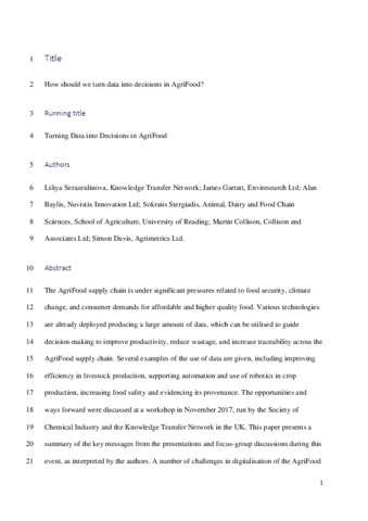 Serazetdinova, L., Garratt, J., Baylis, A., Stergiadis, S. orcid id iconORCID: https://orcid.org/0000-0002-7293-182X, Collison, M. and Davis, S. (2019) How should we turn data into decisions in AgriFood? Journal of the Science of Food and Agriculture, 99 (7). pp. 3213-3219. ISSN 0022-5142 doi: 10.1002/jsfa.9545
