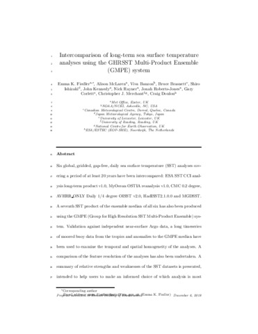 Fiedler, E. K., McLaren, A., Banzon, V., Brasnett, B., Ishizaki, S., Kennedy, J., Rayner, N., Roberts-Jones, J., Corlett, G., Merchant, C. J. orcid id iconORCID: https://orcid.org/0000-0003-4687-9850 and Donlon, C. (2019) Intercomparison of long-term sea surface temperature analyses using the GHRSST Multi-Product Ensemble (GMPE) system. Remote Sensing of Environment, 222. pp. 18-33. ISSN 0034-4257 doi: 10.1016/j.rse.2018.12.015