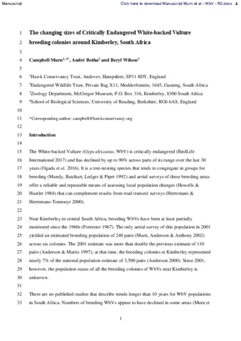 Murn, C. orcid id iconORCID: https://orcid.org/0000-0003-4064-6060, Botha, A. and Wilson, B. (2017) The changing sizes of critically endangered white-backed vulture breeding colonies around Kimberley, South Africa. African Journal of Wildlife Research, 47 (2). pp. 144-148. ISSN 2410-7220 doi: 10.3957/056.047.0144