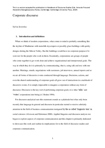 This chapter begins with an overview of the major topics and directions in research on corporate discourse. First, studies concerned with internal corporate talk are discussed. Contrary to the common perception that corporate talk is dry and purely transactional, discourse-analytical and sociolinguistic studies of corporate talk have shown the prominence of interpersonal discourse features (hedges, humour, politeness, impoliteness) highlighting that in corporate life relational goals are as important as transactional ones. The chapter moves on to outline research on corporate communication with the outside world focusing specifically on discursive strategies that corporations employ to legitimise their actions and to persuade or dissuade stakeholders. Increasingly social media have become an important site for maintaining public relations. Yet, context collapse poses a challenge to business as usual and opens up ways for a wider public scrutiny of corporate practices. The chapter concludes with a discussion of some of the practical and ethical issues that arise when ‘doing’ a critical analysis of corporate discourses and outlines some of the opportunities and benefits that criticality and language awareness can bring to corporate life.
