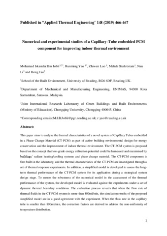 Jobli, M. I., Yao, R. orcid id iconORCID: https://orcid.org/0000-0003-4269-7224, Luo, Z. orcid id iconORCID: https://orcid.org/0000-0002-2082-3958, Shahrestani, M. orcid id iconORCID: https://orcid.org/0000-0002-8741-0912, Li, N. and Liu, H. (2019) Numerical and experimental studies of a capillary-tube embedded PCM component for improving indoor thermal environment. Applied Thermal Engineering, 148. pp. 466-477. ISSN 1359-4311 doi: 10.1016/j.applthermaleng.2018.10.041