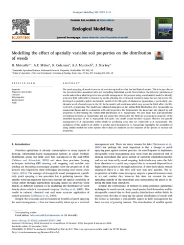 Metcalfe, H., Milne, A. E., Coleman, K., Murdoch, A. J. and Storkey, J. (2019) Modelling the effect of spatially variable soil properties on the distribution of weeds. Ecological Modelling, 396. pp. 1-11. ISSN 0304-3800 doi: 10.1016/j.ecolmodel.2018.11.002