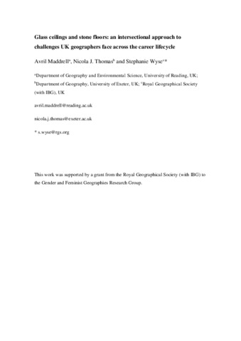 Maddrell, A. orcid id iconORCID: https://orcid.org/0000-0003-2941-498X, Thomas, N. and Wyse, S. (2019) Glass ceilings and stone floors: an intersectional approach to challenges UK geographers face across the career lifecycle. Geografiska Annaler: Series B Human Geography, 101 (1). pp. 7-20. ISSN 1468-0467 doi: 10.1080/04353684.2018.1555670