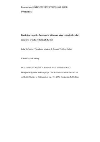 Hofweber, J., Marinis, T., & Treffers-Daller, J. (2016). Effects of dense code-switching on executive control. Linguistic Approaches to Bilingualism, 6(5), 648-668. doi: 10.1075/lab.15052.hof