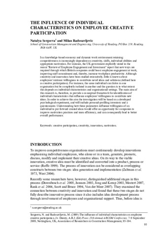 Sergeeva, N. and Radosavljevic, M. (2009) The influence of individual characteristics on employee creative participation. In: 25th Annual ARCOM Conference, 7-9 September 2009, Nottingham, UK, pp. 97-104.