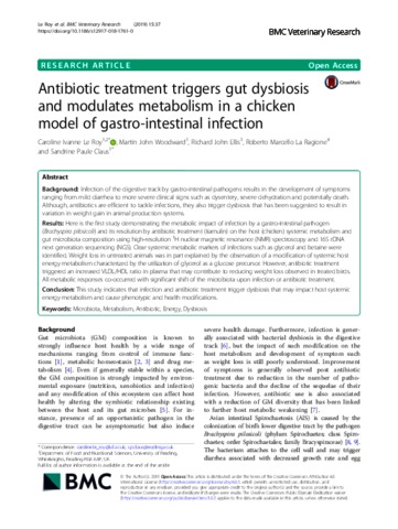 Le Roy, C. I., Woodward, M. J., Ellis, R. J., La Ragione, R. M. and Claus, S. P. (2019) Antibiotic treatment triggers gut dysbiosis and modulates metabolism in a chicken model of gastro-intestinal infection. BMC Veterinary Research, 15. 37. ISSN 1746-6148 doi: 10.1186/s12917-018-1761-0