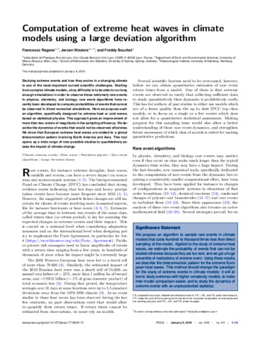 Ragone, F., Wouters, J. orcid id iconORCID: https://orcid.org/0000-0001-5418-7657 and Bouchet, F. (2018) Computation of extreme heat waves in climate models using a large deviation algorithm. Proceedings of the National Academy of Sciences of the United States of America, 115 (1). pp. 24-29. ISSN 0027-8424 doi: 10.1073/pnas.1712645115