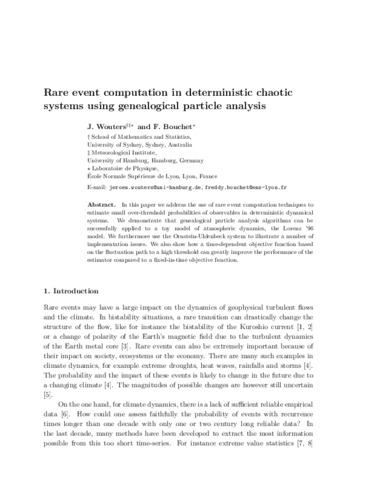 In this paper we address the use of rare event computation techniques to estimate small over-threshold probabilities of observables in deterministic dynamical systems. We demonstrate that genealogical particle analysis algorithms can be successfully applied to a toy model of atmospheric dynamics, the Lorenz '96 model. We furthermore use the Ornstein–Uhlenbeck system to illustrate a number of implementation issues. We also show how a time-dependent objective function based on the fluctuation path to a high threshold can greatly improve the performance of the estimator compared to a fixed-in-time objective function.