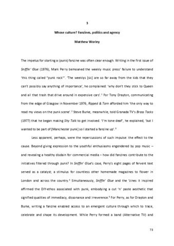 This chapter offers a case study of three punk-related fanzines. The three ‘zines considered – JOLT, Anathema and Hard As Nails – each, in their different ways, sought to inform and (re)direct the cultures of which they formed part. They voiced opinion and contributed to a conversation. Beneath any prevailing cultural narrative, be it defined in newsprint or captured on film to be replayed over-and-over as disembodied spectacle, lay alternate interpretations scribbled, typed and held together with glue and staples. In fanzines we find cultures recorded from the bottom-up rather than the top-down.