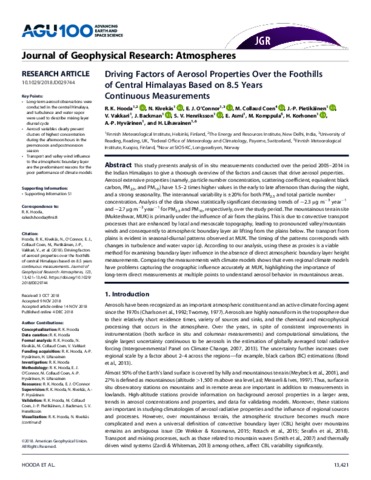 Hooda, R. K., Kivekäs, N., O'Connor, E. J., Collaud Coen, M., Pietikäinen, J.-P., Vakkari, V., Backman, J., Henriksson, S. V., Asmi, E., Komppula, M., Korhonen, H., Hyvärinen, A.-P. and Lihavainen, H. (2018) Driving factors of aerosol properties over the foothills of central Himalayas based on 8.5 years continuous measurements. Journal of Geophysical Research: Atmospheres, 123 (23). pp. 13421-13442. ISSN 2169-8996 doi: 10.1029/2018jd029744