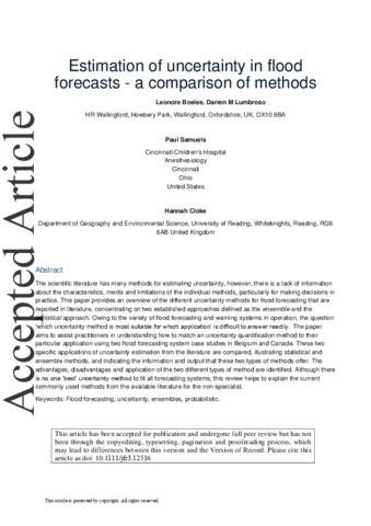The scientific literature has many methods for estimating uncertainty, however, there is a lack of information about the characteristics, merits and limitations of the individual methods, particularly for making decisions in practice. This paper provides an overview of the different uncertainty methods for flood forecasting that are reported in literature, concentrating on two established approaches defined as the ensemble and the statistical approach. Owing to the variety of flood forecasting and warning systems in operation, the question ‘which uncertainty method is most suitable for which application’ is difficult to answer readily. The paper aims to assist practitioners in understanding how to match an uncertainty quantification method to their particular application using two flood forecasting system case studies in Belgium and Canada. These two specific applications of uncertainty estimation from the literature are compared, illustrating statistical and ensemble methods, and indicating the information and output that these two types of methods offer. The advantages, disadvantages and application of the two different types of method are identified. Although there is no one ‘best’ uncertainty method to fit all forecasting systems, this review helps to explain the current commonly used methods from the available literature for the non-specialist.
