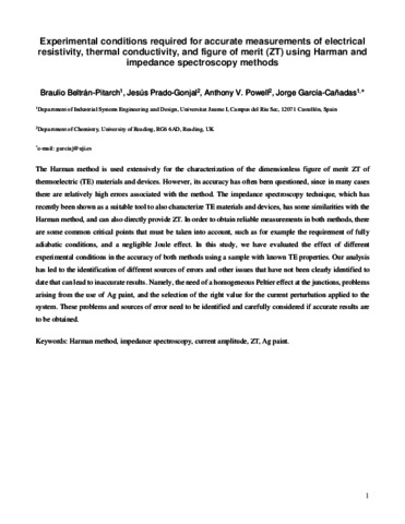 Beltrán-Pitarch, B., Prado-Gonjal, J., Powell, A. and Garcia-Canadas, J. (2019) Experimental conditions required for accurate measurements of electrical resistivity, thermal conductivity, and figure of merit (ZT) using Harman and impedance spectroscopy methods. Journal of Applied Physics, 125 (2). 025111. ISSN 0021-8979 doi: 10.1063/1.5077071