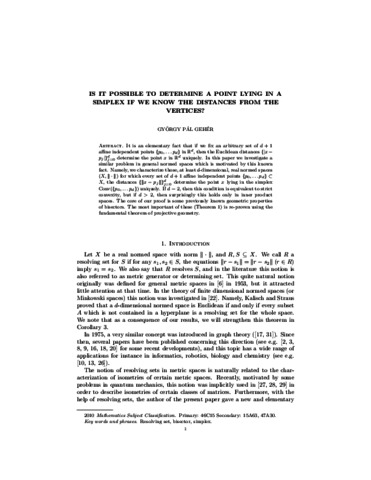 Gehér, G. P. (2016) Is it possible to determine a point lying in a simplex if we know the distances from the vertices? Journal of Mathematical Analysis and Applications, 439 (2). pp. 651-663. ISSN 0022-247X doi: 10.1016/j.jmaa.2016.03.024