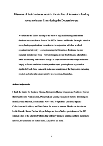 We examine the factors leading to the onset of organizational rigidities in the dominant vacuum cleaner firms of the 1920s, Hoover and Eureka. Strategies aimed at strengthening organizational commitment, in conjunction with low levels of organizational diversity – owing to managerial hierarchies dominated by men recruited from the sale force - restricted organizational flexibility and adaptability, while accentuating resistance to change. In conjunction with core competencies that largely reflected conditions in their previous rapid growth phases, organisation rigidity left both firms vulnerable to the new conditions of the Depression, including product and value chain innovation by a new entrant, Electrolux.
