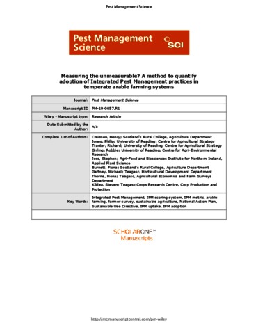 Creissen, H., Jones, P. orcid id iconORCID: https://orcid.org/0000-0003-3464-5424, Tranter, R. orcid id iconORCID: https://orcid.org/0000-0003-0702-6505, Girling, R. orcid id iconORCID: https://orcid.org/0000-0001-8816-8075, Jess, S., Burnett, F., Gaffney, M., Thorne, F. and Kildea, S. (2019) Measuring the unmeasurable? A method to quantify adoption of integrated pest management practices in temperate arable farming systems. Pest Management Science, 75 (12). pp. 3144-3152. ISSN 1526-4998 doi: 10.1002/ps.5428