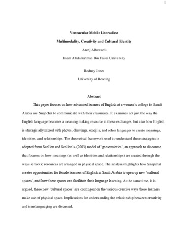 This paper focuses on how advanced learners of English at a woman’s college in Saudi Arabia use Snapchat to communicate with their classmates. It examines not just the way the English language becomes a meaning making resource in these exchanges, but also how English is strategically mixed with photos, drawings, emoji’s, and other languages to create meanings, identities, and relationships. The theoretical framework used to understand these strategies is adopted from Scollon and Scollon’s (2003) model of ‘geosemiotics’, an approach to discourse that focuses on how meanings (as well as identities and relationships) are created through the ways semiotic resources are arranged in physical space. The analysis highlights how Snapchat creates opportunities for female learners of English in Saudi Arabia to open up new ‘cultural spaces’, and how these spaces can facilitate their language learning. At the same time, it is argued, these new ‘cultural spaces’ are contingent on the various creative ways these learners make use of physical space. Implications for understanding the relationship between creativity and translanguaging are discussed.