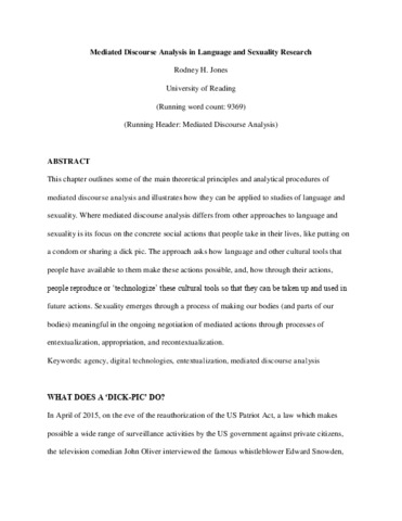 This chapter outlines some of the main theoretical principles and analytical procedures of mediated discourse analysis and illustrates how they can be applied to studies of language and sexuality. Where mediated discourse analysis differs from other approaches to language and sexuality is its focus on the concrete social actions that people take in their lives, like putting on a condom or sharing a dick pic. The approach asks how language and other cultural tools that people have available to them make these actions possible, and, how through their actions, people reproduce or ‘technologize’ these cultural tools so that they can be taken up and used in future actions. Sexuality emerges through a process of making our bodies (and parts of our bodies) meaningful in the ongoing negotiation of mediated actions through processes of entextualization, appropriation, and recontextualization.