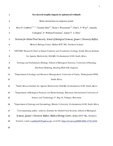 Cuthbert, R. N., Dalu, T., Wasserman, R. J., Weyl, O. L. F., Callaghan, A. orcid id iconORCID: https://orcid.org/0000-0002-2731-3352, Froneman, W. and Dick, J. T. A. (2019) Sex‐skewed trophic impacts in ephemeral wetlands. Freshwater Biology, 64 (2). pp. 359-366. ISSN 0046-5070 doi: 10.1111/fwb.13228