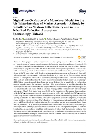 Woden, B., Skoda, M., Hagreen, M. and Pfrang, C. (2018) Night-time oxidation of a monolayer model for the air–water interface of marine aerosol - a study by simultaneous neutron reflectometry and in situ infra-red reflection absorption spectroscopy (IRRAS). Atmosphere, 9 (12). 471. ISSN 2073-4433 doi: 10.3390/atmos9120471