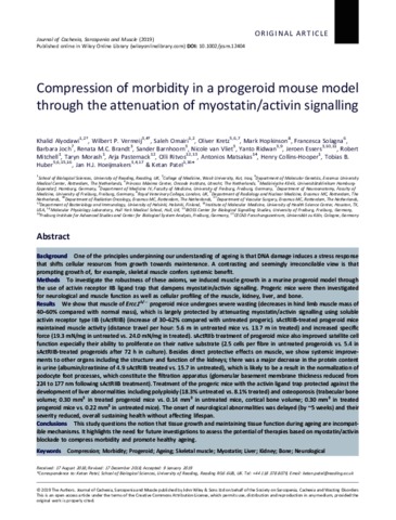 Alyodawi, K., Vermeij, W. P., Omairi, S., kretz, O., Hopkinson, M., Solagna, F., Joch, B., Brandt, R. M. C., Barnhoorn, S., van Vliet, N., Ridwan, Y., Essers, J., Mitchell, R., Morash, T., Pasternack, A., Ritvos, O., Matsakas, A., Collins-Hooper, H., Huber, T. B., Hoeijmakers, J. H. J. and Patel, K. (2019) Compression of morbidity in a progeroid mouse model through the attenuation of myostatin/activin signalling. Journal of Cachexia, Sarcopenia and Muscle, 10 (3). pp. 662-686. ISSN 2190-6009 doi: 10.1002/jcsm.12404