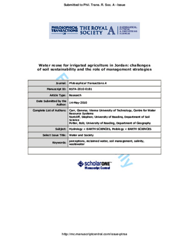 Carr, G., Nortcliff, S. and Potter, R. B. (2010) Water reuse for irrigated agriculture in Jordan: challenges of soil sustainability and the role of management strategies. Philosophical Transactions of the Royal Society A: Mathematical, Physical and Engineering Sciences, 368 (1931). pp. 5315-5321. ISSN 1364-503X doi: 10.1098/rsta.2010.0181