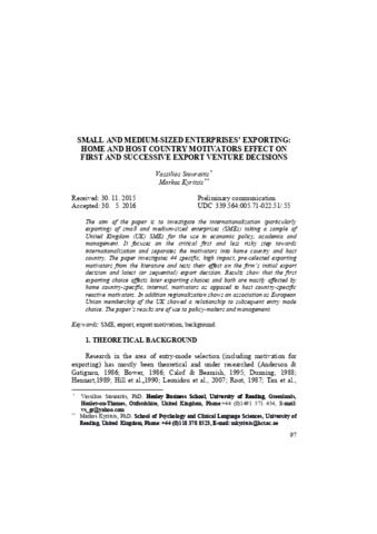 Stouraitis, V. and Kyritsis, M. orcid id iconORCID: https://orcid.org/0000-0002-7151-1698 (2016) Small and medium-sized enterprises’ exporting: Home and host country motivators effect on first and successive export venture decisions. Management : Journal of Contemporary Management Issues, 21 (1). pp. 97-115. ISSN 1846-3363