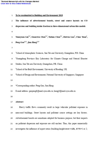 The influence of advertisement boards, street and source layouts on CO dispersion and building intake fraction in three-dimensional urban-like models.