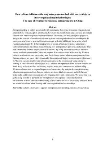 Entrepreneurship is widely associated with uncertainty that stems from inter-organizational relationships. The concept of uncertainty, however, has mostly been analyzed as a uni-variate variable that addresses perceived environmental uncertainty. In this conceptual paper we analyze the concept of uncertainty stemming from inter-organizational relationships in the entrepreneurial context as a multivariate concept, utilizing Milliken's framework, which examines uncertainty by differentiating between state, effect and response uncertainty. Cultural influences are critical in determining how entrepreneurs perceive, analyze and deal with uncertainty in inter-organizational situations. By using illustrative cases of returnee versus local entrepreneurs in China, we propose that entrepreneurs influenced by Western cultures tend to treat state uncertainty as a focal change event, whereas entrepreneurs from Eastern cultures are more likely to consider the contextual factors; entrepreneurs influenced by Western cultures tend to limit effect uncertainty in the professional work setting by looking at cause-effect in an analytical way, whereas entrepreneurs from Eastern cultures are more likely to look at effect uncertainty beyond work; and entrepreneurs influenced by Western cultures tend to respond to perceived uncertainty by analytical-strategic thinking, whereas entrepreneurs from Eastern cultures are more likely to connect multiple factors holistically and to react to uncertainty by engaging the wider community. We argue that in a globalizing world it is pertinent for entrepreneurs who operate in the international environment to have a better understanding of the various facets of uncertainty and how these are related to culture when dealing with inter-organizational relationships.